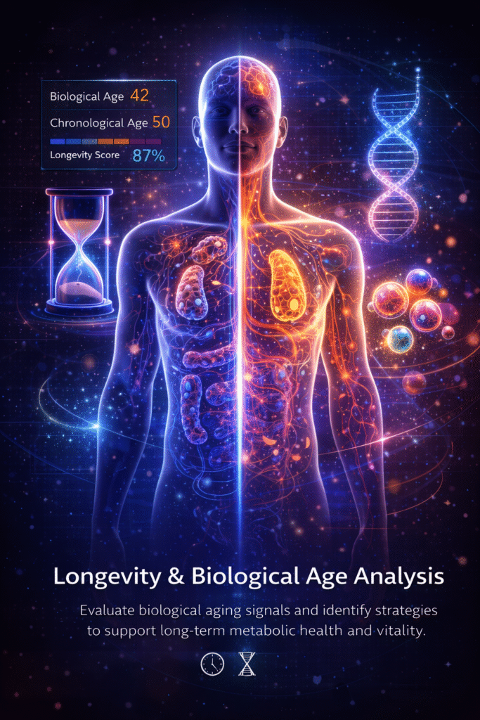 Longevity analysis evaluates biological aging signals and long-term metabolic resilience.